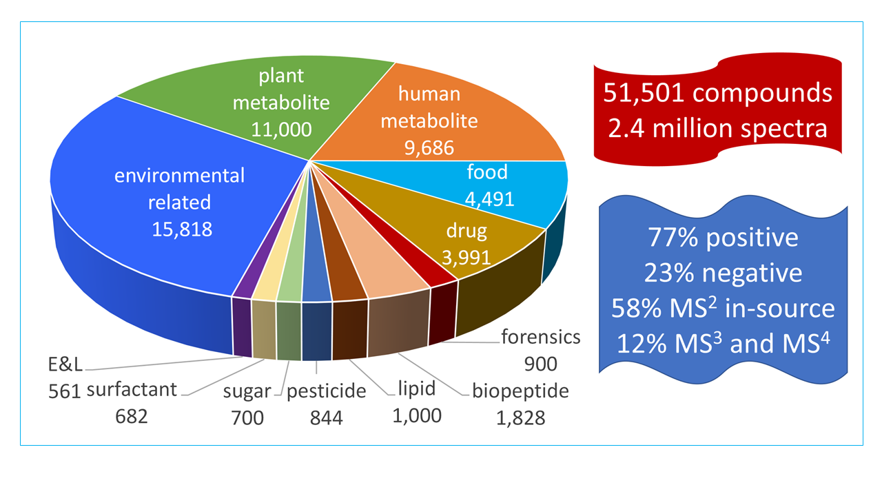 • 2,374,064 tandem spectra with a wide range of fragmentation conditions including positive and negative modes from ion-trap (up to MS4) and ‘beam-type’ collision cells (QTOF, HCD, and QqQ); new spectra acquired at high accuracy and resolution